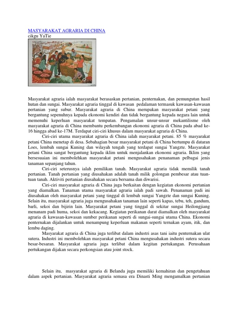Masyarakat Agraria Di China 1 2 Masyarakat Agraria Belanda Dan China Salah Satu Ciri Kegiatan Ekonomi Yang Dijalankan Ialah Aktiviti Bercucuk Tanam Secara Sara Diri Vtyuip from reader016.fdokumen.com Masyarakat agraria merupakan masyarakat yang bergantung kepada kegiatan ekonomi berasaskan kepada pertanian iaitu bercucuk tanam dan menternak binatang sebagai sumber kehidupan mereka. Masyarakat agraria juga mengusahakan penternakan lembu tenusu dan lembu daging. Mereka melibatkan diri dalam kegiatan yang berasaskan kepada aktiviti pertanian dan penternakan. Juhaimi majid ciri ciri masyarakat agraria di belanda abad ke 16 dan ke 17 masihi. Hasil pertanian ini dijual di pasar tempatan dan bandar2 lain. Kaedah ini akan mengembalikan kesuburan tanah dan meningkatkan lagi hasil pengeluaran pertanian. Mereka mengamalkan sistem pertanian padang terbuka. Pertanian boleh terbahagi kepada penanaman, perikanan & penternakan.