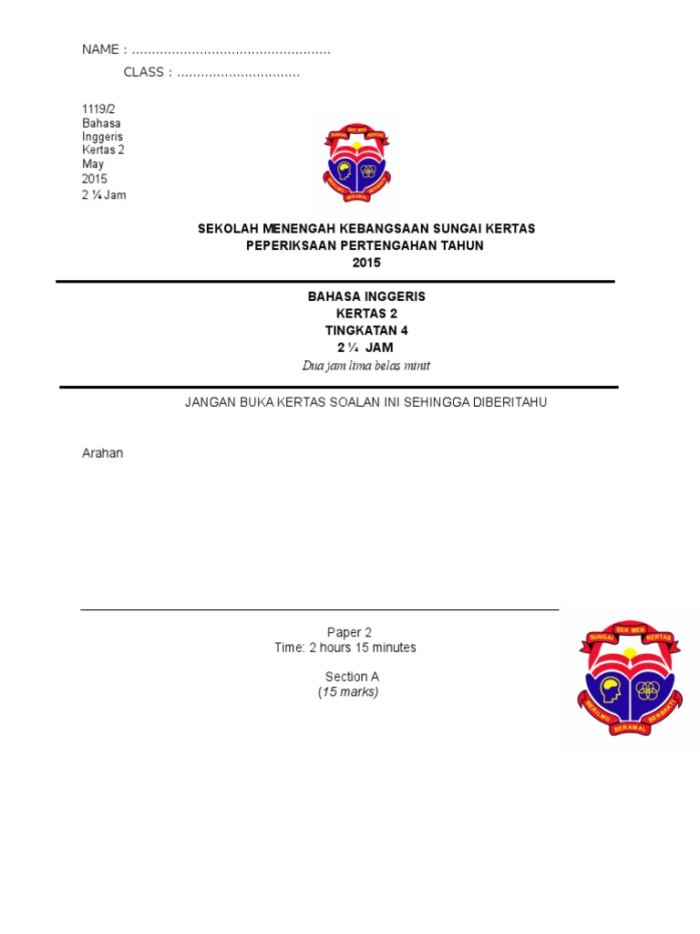 Related : Soalan Bahasa Inggeris Tingkatan 4 : Exam Form 1 Soalan Tingkatan 1 Bahasa Inggeris / Tulis nama dan tingkatan anda pada ruang yang disediakan..