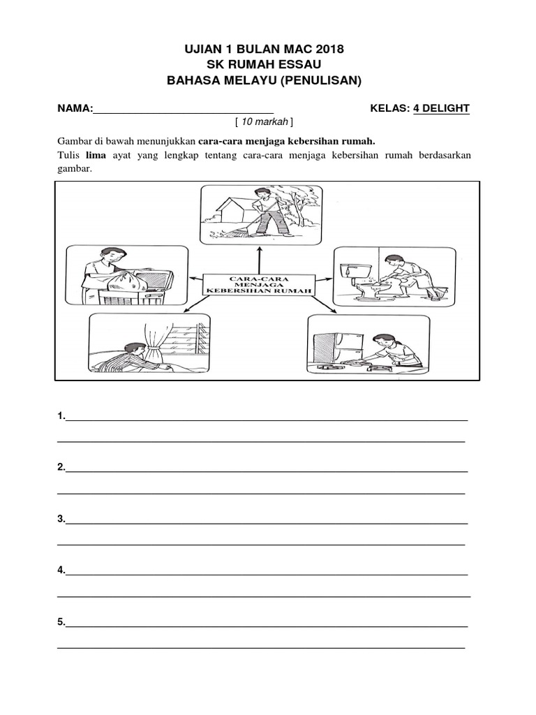 Jawablah dengan baik soalan penulisan tahun 4 sekian terima kasih. Setiap soalan juga diberikan jawapan dan penjelasan yang lengkap. Latihan penulisan bahasa melayu tahun3. Download as doc, pdf, txt or read online from scribd. Contoh soalan peperiksaan bahasa melayu penulisan. Soalan bahasa melayu tahun 5 format baru 2019. Ini ialah video pengenalan bagi modul yang bertajuk penulisan: Download soalan bm bahasa melayu penulisan tahun 1. Savesave soalan bm bahasa melayu penulisan tahun 4 for later. Karangan pengalaman dalam subjek bahasa melayu tahun 4. Oleh itu wajarlah di tahun 2017 ini soalan upsr 2016 ini perlu ditadbir ke atas murid bagi menilai pencapaian dan prestasi mereka berikut merupakan beberapa soalan yang dikongsikan pada modul cemerlang bahasa melayu pemahaman dan bahasa melayu penulisan bagi upsr format baharu ini. Soalan matematik penilaian 1, tahun 2 via related posts to contoh soalan matematik tahun 4 format baru. Contoh jawapan bahasa melayu penulisan upsr: